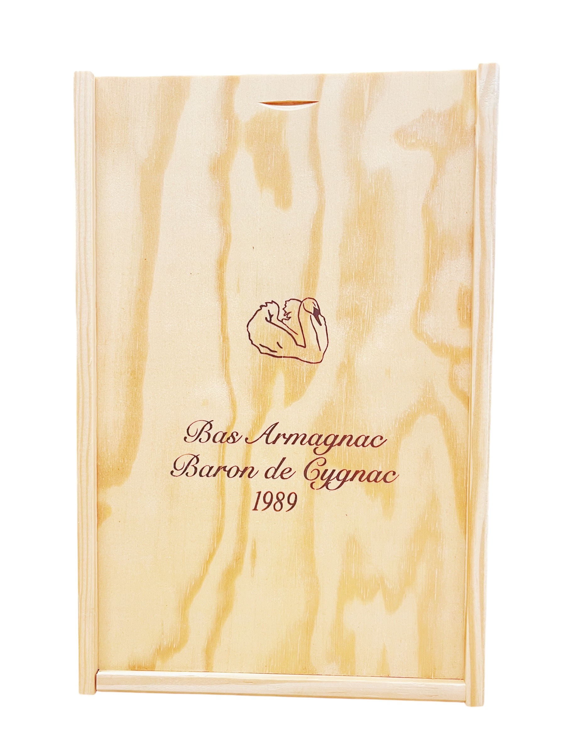 Ein eindrucksvoller Jahrgangs-Armagnac aus dem Jahr 1989 Baron de Cygnac in der charakteristischer Boxbeutelflasche und Holzkiste.