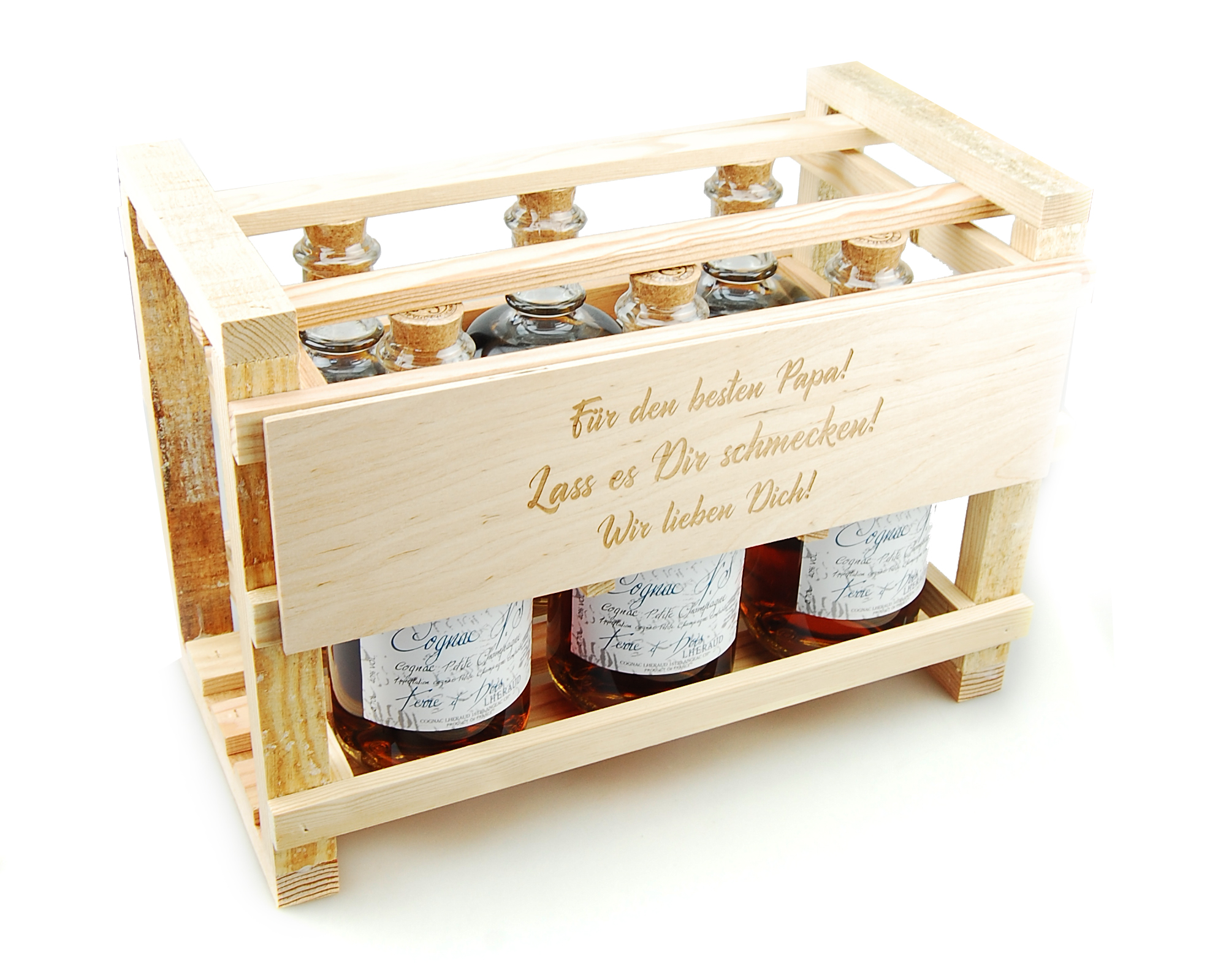 Die Lieferung dieses einzigartigen Geschenksets Terre & Bois - 6 Flaschen Cognac VS Lheraud á 0,7 Liter erfolgt mit Holzkiste.