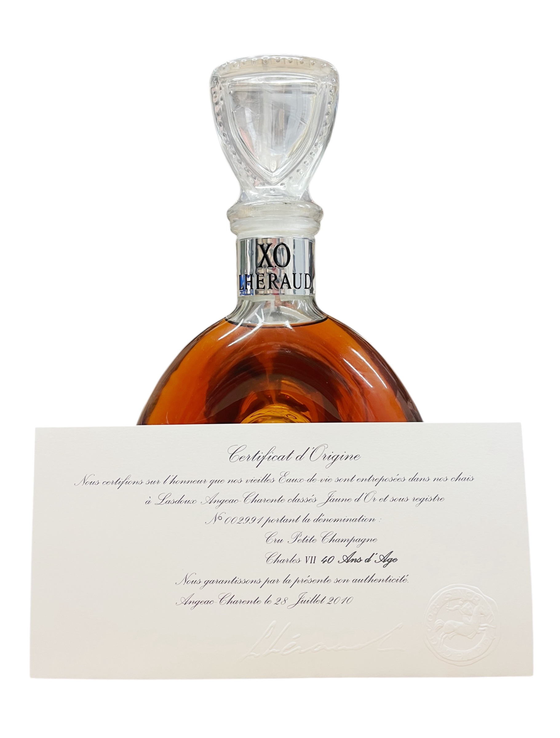 - In dieser superben mundgeblasenen Karaffe "Charles VII" befinden sich 0,7l feinster Cognac XO mit 44% Alc. aus der Fine Petite Champagne. Der 40 Jahre alte Cognac wurde in dem mit Holzkohle geheizten Alambic Charentais destilliert. Es ist ein sensationeller Cognac mit einem vielschichtigen Bouquet von Blüten, Blumen und Edelnüssen. Körperreiche Aromen mit sehr langem Abgang!