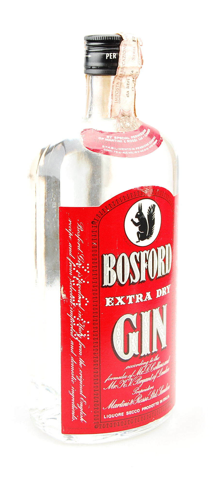 Der damals weltberühmte Bosford Extra Dry Gin wird nach einem typischen, alten und klassischen englischen Rezept produziert, mit einer weltweit anerkannten Qualitätsgarantie. Der Bosford Dry Gin ist nicht nur eine historische Marke, sondern vor allem eine in den 60er bis 80er Jahren weltberühmte und überall beliebte Bar-Marke, die in keiner gut sortierten Bar fehlen durfte und sich vorallem durch eine sehr gute Qualität und einen moderaten Preis auszeichgezeichnet hat. Dieser Dry Gin mit gestanzten Etikett mit der Jahrszahl 1972 wurde nach dem Rezept von Mr. Bryants aus London produziert und von der renommierten italienischen Hersteller-Firma Martini & Rossi in Flaschen abgefüllt.
