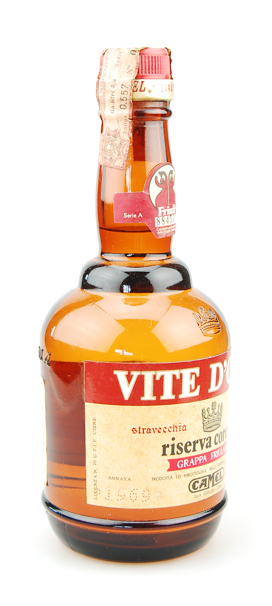 Ein Jahrgangsgrappa Riserva Corona tre anni Vite d´Oro Bianca 1969 aus dem traditionsreichen und renommierten Erzeugerhaus von Camel, einem Friauler Erzeugerhaus, welches mit unter zu den renommiertesten Häusern Italiens zählt. Die Distillierie liegt direkt am Fuße der Osthügel im Friaul, in Marsure di Povoletto, nicht weit von der langobardischen Stadt Cividale entfernt, einem Weinbaugebiet, das bekannt für erstklassige Trauben und Trester ist.