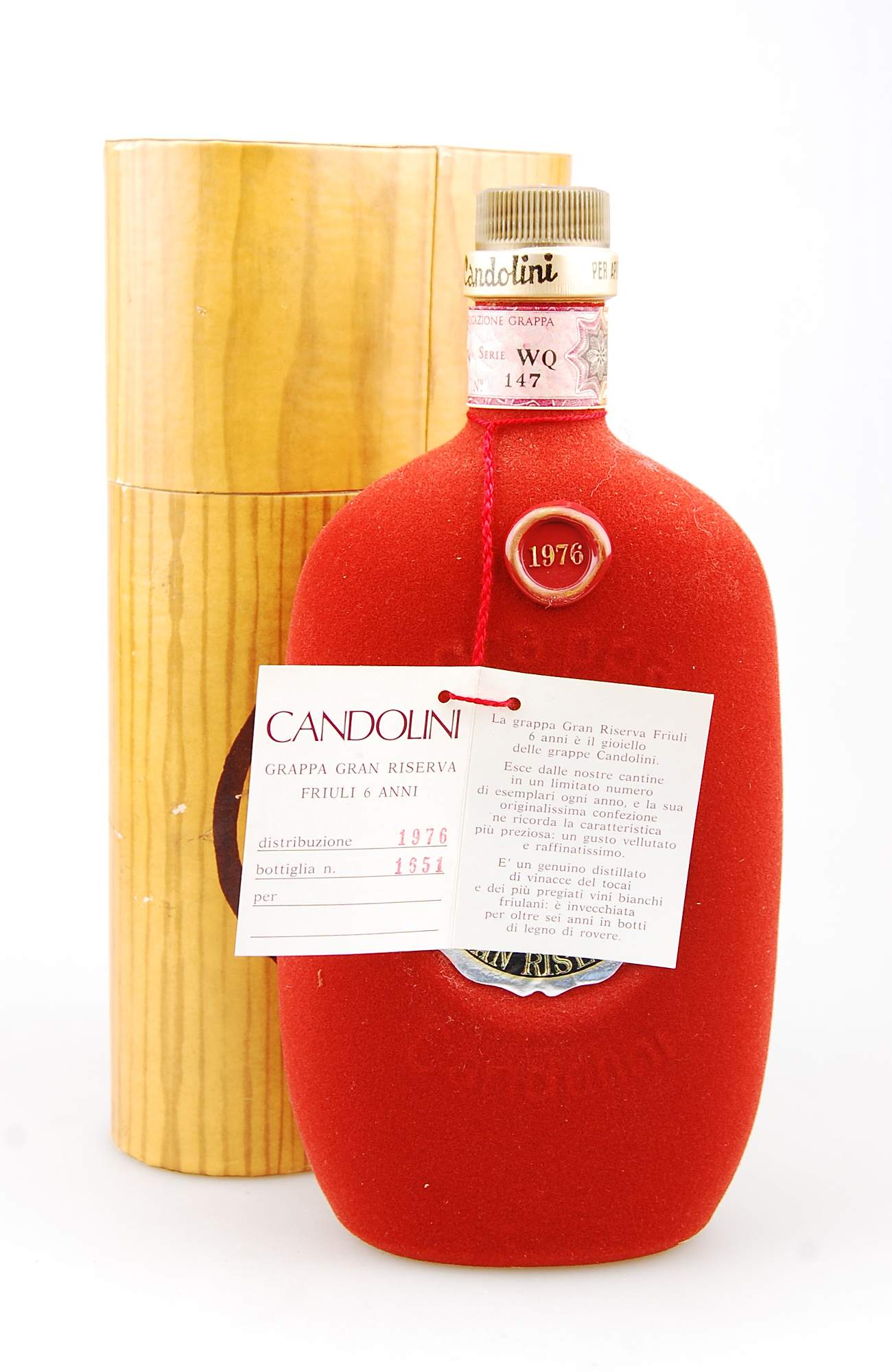 Eine außergewöhnliche und besonders seltene Top-Rarität: Jahrgangsgrappa 1976 aus der alten und bekannten Distillerie Candolini. Eine sensationalle Grappa-Rarität, eine auf insgesamt nur wenige tausend Flaschen limitierte Serie dieses einzigartigen Jahrgangs 1976.