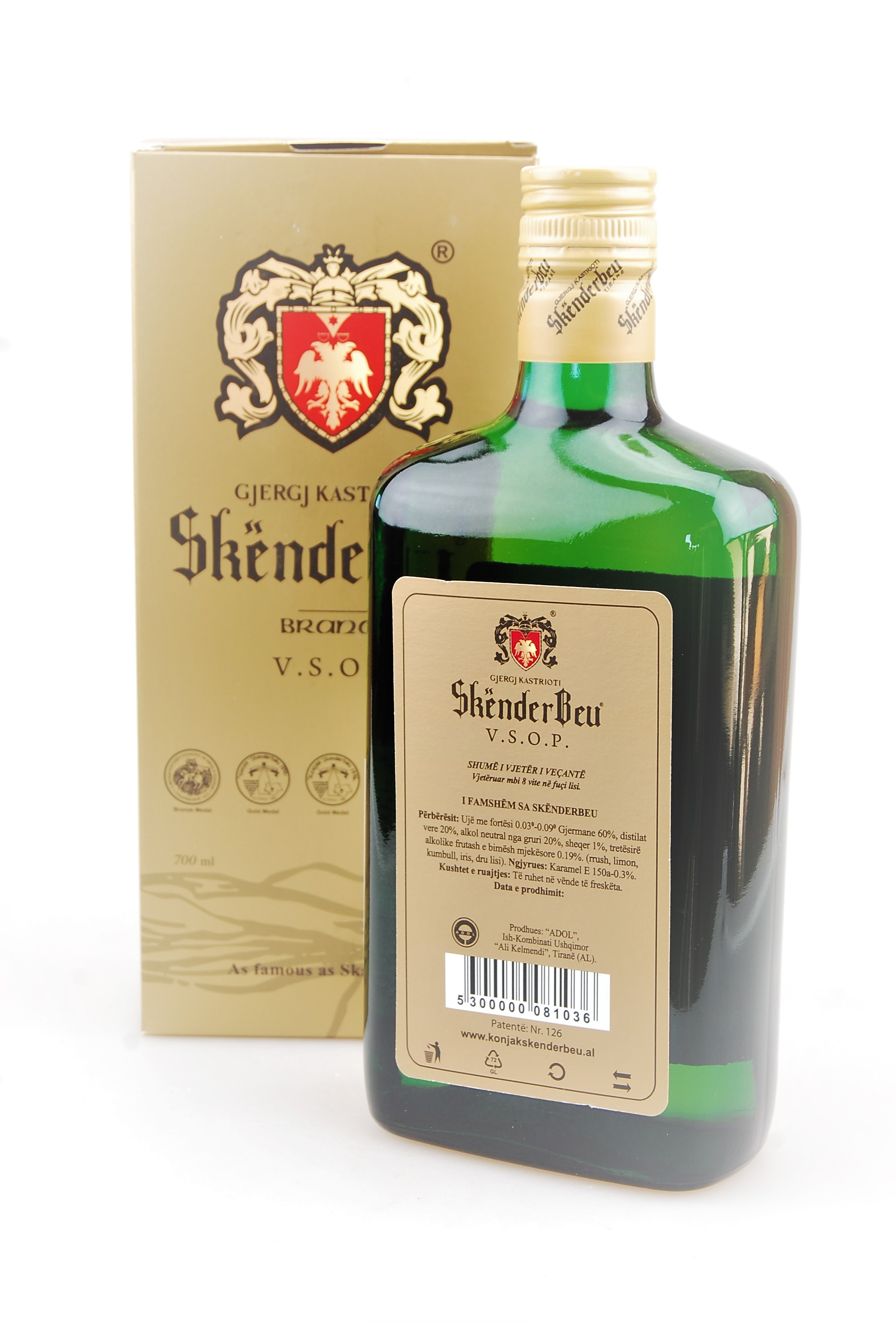 Original albanischer Skenderbeu Konjak, benannt nach dem großen albanischen Fürsten Gjergj Kastrioti, genannt Skenderbeg (alb. Skenderbeu, 1405 - 1468).