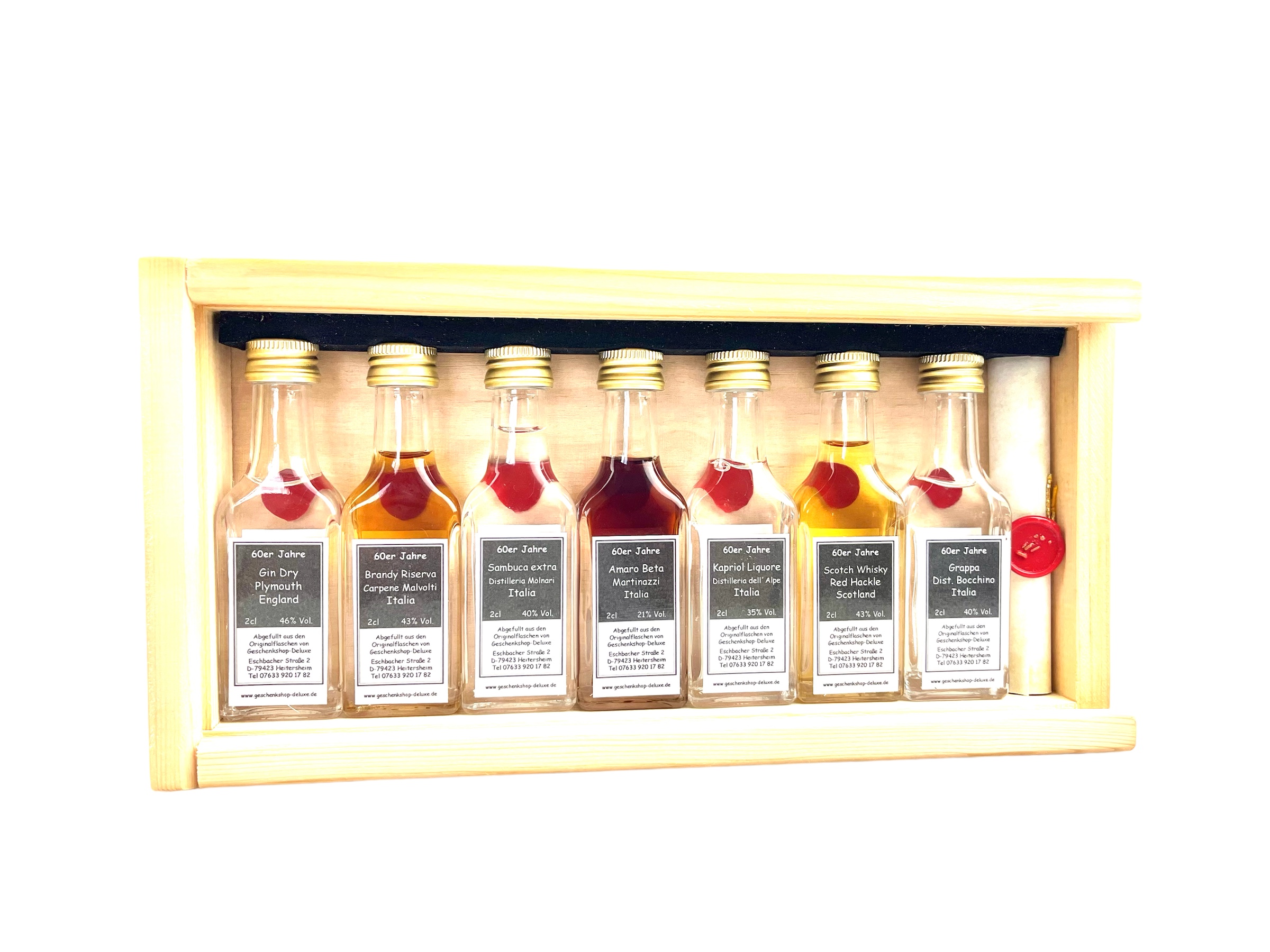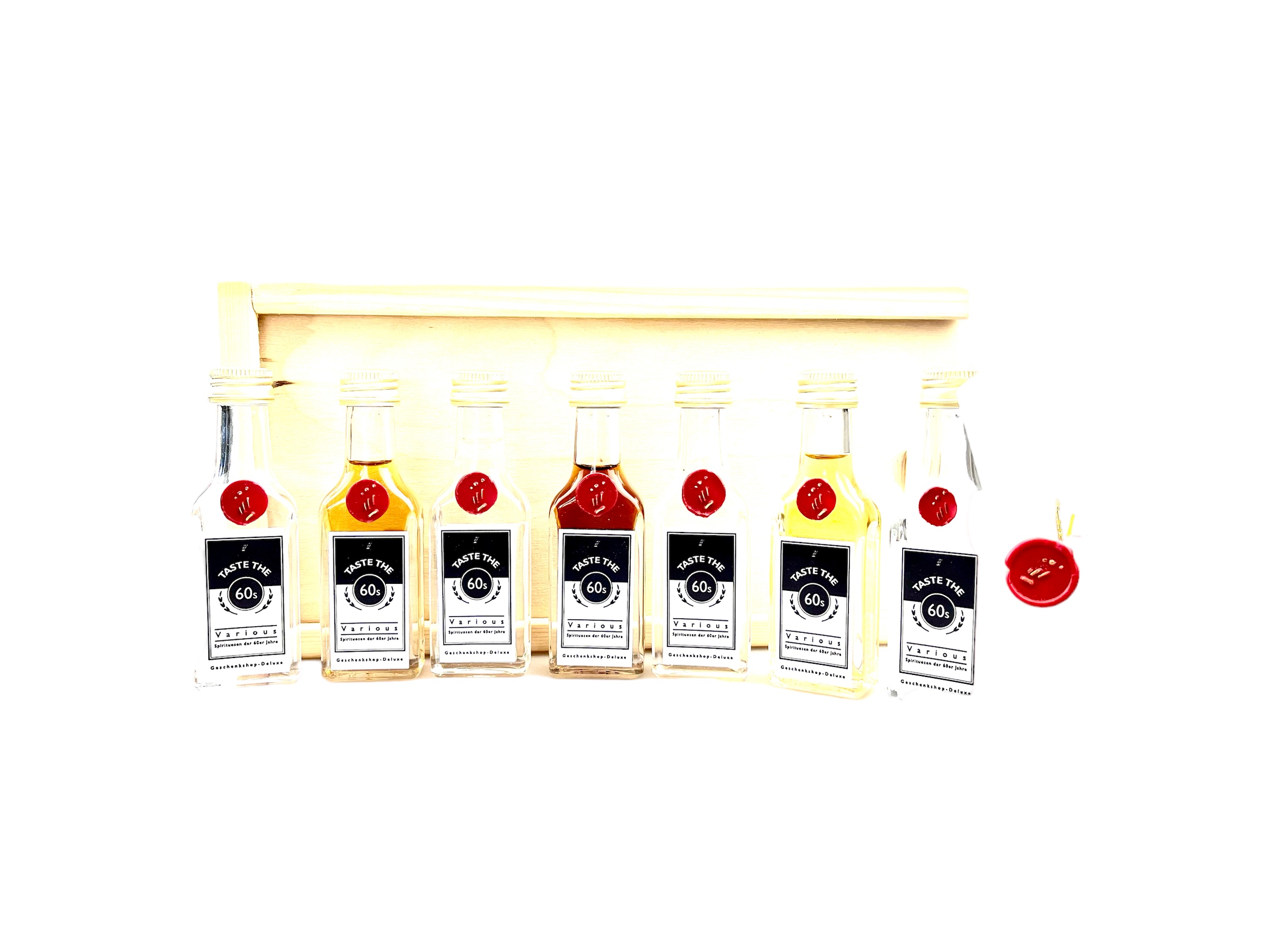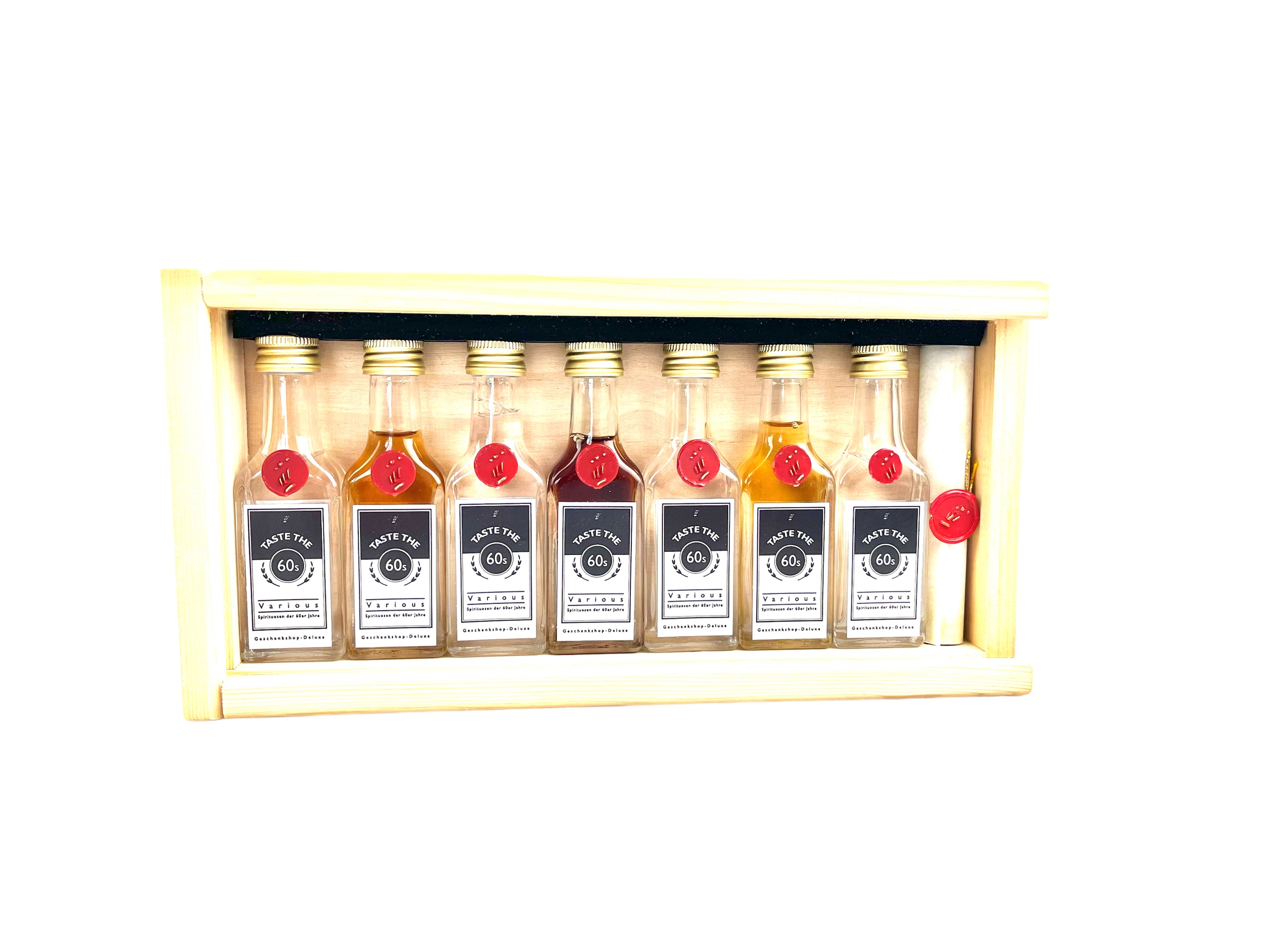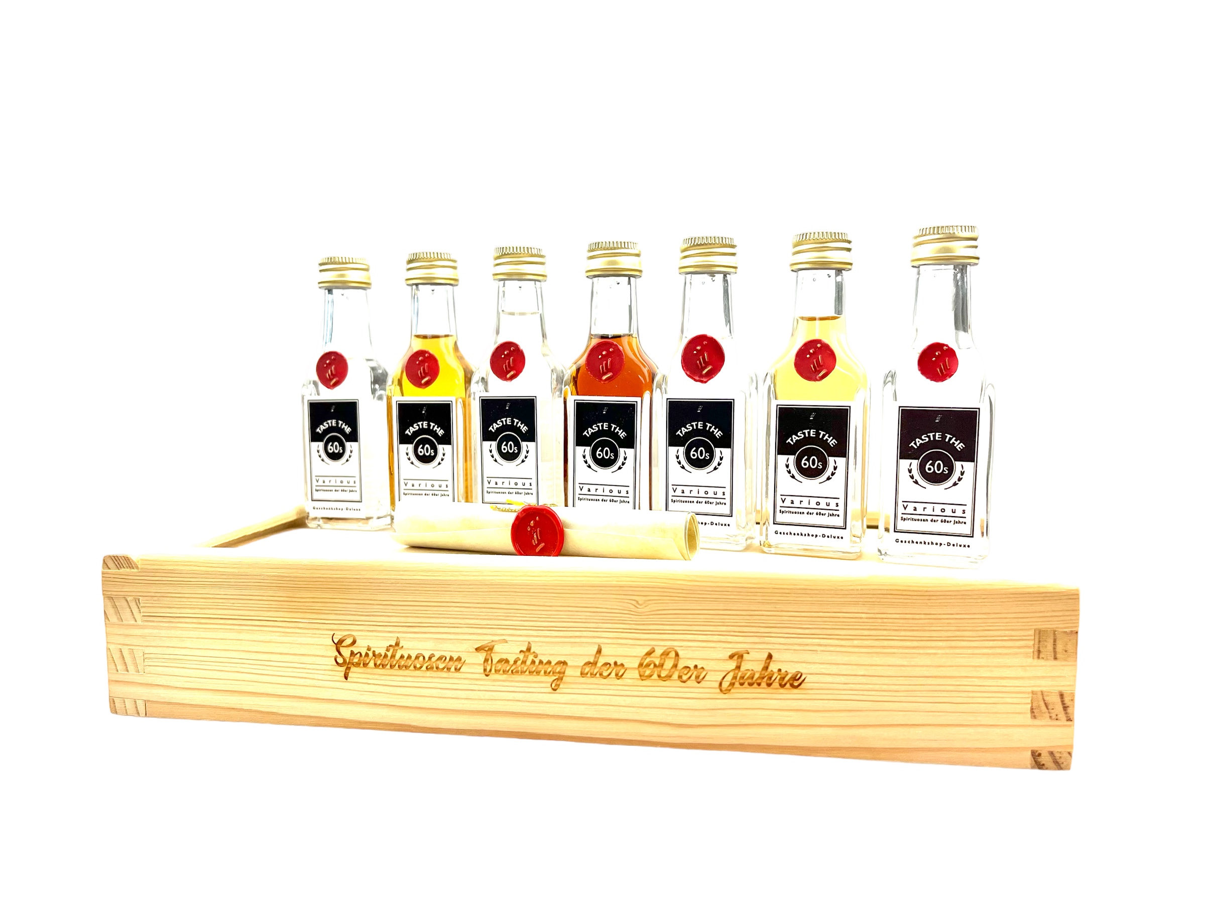 Dieses spannende Probier-Set bietet ihnen die perfekte Möglichkeit 7 verschiedene Spirituosen-Sorten der 60er Jahre zu testen. Dieses Tasting-Set verführt sie in eine geheimnisvolle Zeitreise und bietet den Beschenkten, die in den Jahren zwischen 1960 und 1969 geboren wurden, großartige Genussmomente mit verschiedensten Spirituosen-Arten für jede Geschmacksrichtung. Lassen sie sich überraschen von den beindruckenden Raritäten-Probierfläschchen der 60er Jahre inklusive Kurzbeschreibung der jeweiligen Abfüllungen in einzigartiger Echtholzkiste, auf Wunsch auch mit ganz persönlicher Personalisierung.