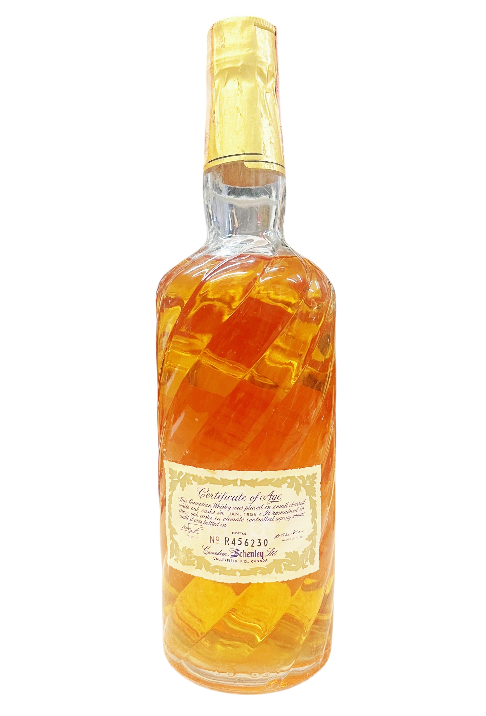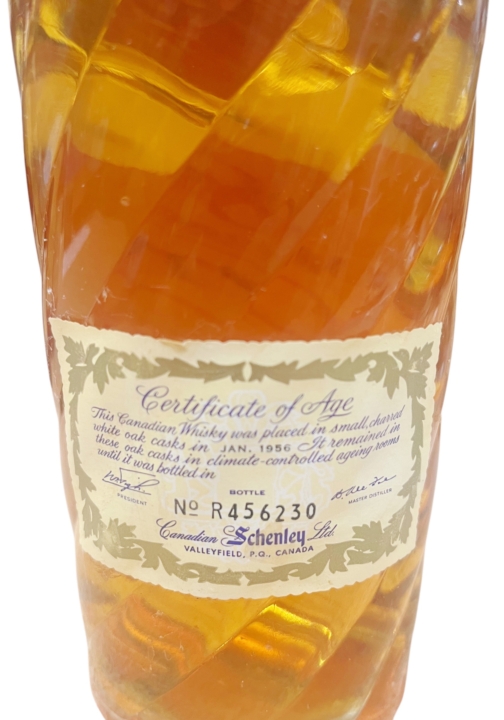 Canadian Blend Whisky 1956 Schenley 8 Years Old Distilled. Es handelt sich hierbei um alte Abfüllungen, so können die Banderolen oder Etiketten dieser Raritäten durchaus leichte Alterserscheinungen aufweisen. Destilliert Juni 1956, abgefüllt Juni 1964.